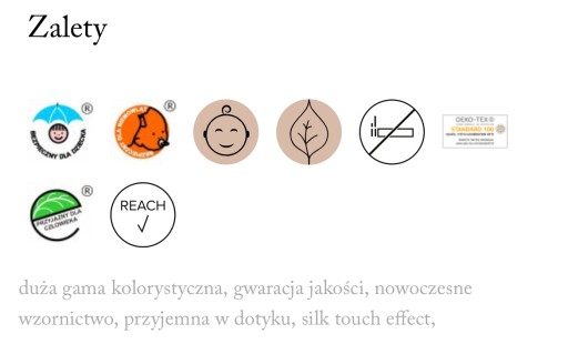 Tkanina zdobyła liczne atesty, które potwierdzają jej wyjątkową jakość. Poniżej kilka z nich: