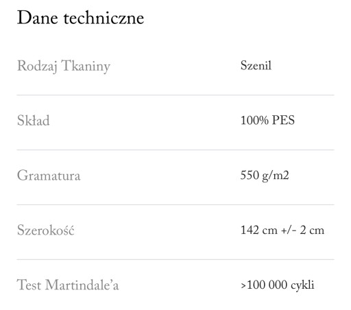 Przedstawiamy specyfikację tkaniny (szczegółowa karta techniczna znajduje się w załączniku):