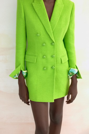 Sukienka o kroju marynarki z kołnierzem z klapami. Długi rękaw. Kieszenie z klapkami z przodu. Wykończenie na podszewce w kontrastowym kolorze. Dwurzędowe zapięcie na guziki z teksturowanym zdobieniem w tym samym odcieniu z przodu.