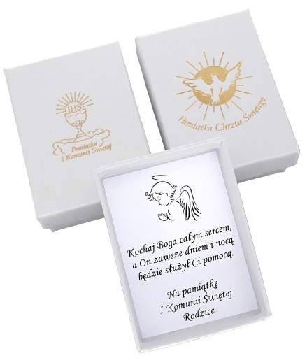 Po zakupie usługi dodatkowej do zamówienia zostanie dołączony zestaw opakowania premium: pudełko na biżuterię z indywidualną dedykacją oraz torebka prezentowa. Do wyboru pudełko z okazji Komunii Świętej, Chrztu Świętego oraz uniwersalne. Dedykacja drukowana jest na złotym, błyszczącym papierze, który jest zintegrowany z pokrywą pudełka. Aby zapobiec przypadkowemu otwieraniu się, zastosowaliśmy zamknięcie na magnes – proste i skuteczne rozwiązanie.