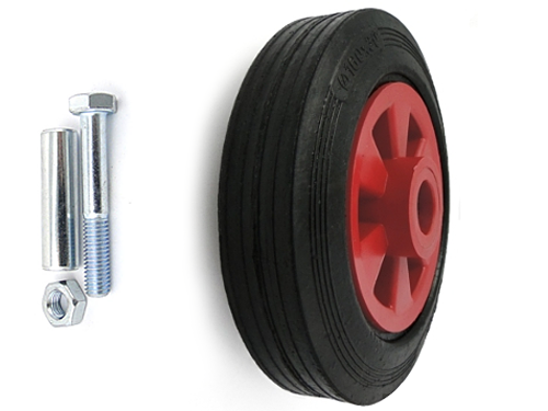 Koło posiada tworzywową obręcz i pełną gumową oponę. W komplecie znajduje się tulejka ze śrubą i nakrętką.