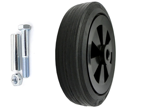 Koło posiada tworzywową obręcz i pełną gumową oponę. W komplecie znajduje się tulejka ze śrubą i nakrętką.