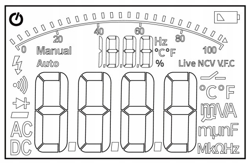 - Ikona automatycznego pomiaru natężenia, częstotliwości, cyklu, pojemności, rezystancji i prądu