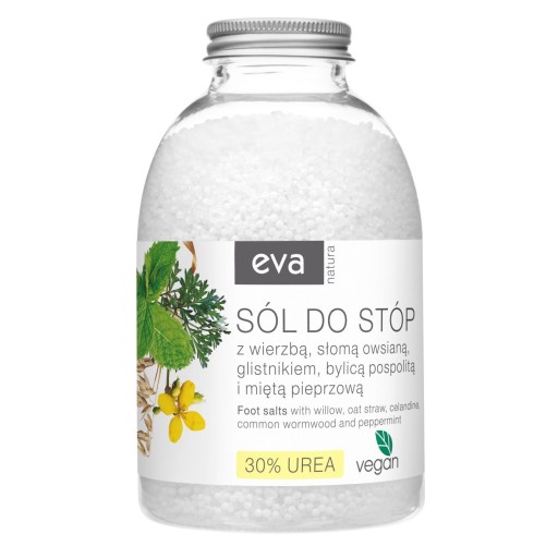 Sól do stóp marki Eva Natura to sprawdzone rozwiązanie wobec zmęczonych stóp. Wysokie stężenie mocznika (30%) sprawia, że sól działa zmiękczająco i złuszczająco na zrogowaciały naskórek. Dzięki zawartości ekstraktów z wierzby, bylicy pospolitej oraz glistnika kosmetyk działa przeciwpotowo. Zawartość słomy owsianej i mięty gwarantuje uczucie natychmiastowego nawilżenia i odprężenia. Podaruj stopom odrobinę przyjemności i rozkoszuj się prawdziwym, domowym SPA!
