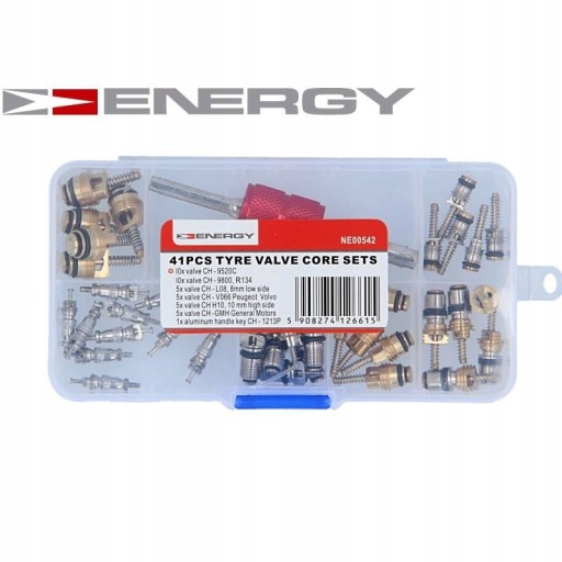 Zestaw zaworków serwisowych do klimatyzacji samochodowej z kluczykiem 41 el Zawory serwisowe znajdują zastosowanie w klimatyzacji samochodowej. W skład zestawu wchodzi klucz do wykręcania / wkręcania zaworków oraz 6 różnych typów zaworków (40 szt. zaworków). 10x zaworek CH-9520C 10x zaworek CH-9800, R134 5x zaworek CH-L08, 8mm low side 5x zaworek CH-V066, Peugeot / Volvo 5x zaworek CH-H10, 10 mm high side 5x zaworek CH-GMH, General Motors 1x klucz do zaworków CH-1213P plastikowe pudełko z 8 przegródkami do dowolnej konfiguracji Zastosowanie: do napełniania i opróżniania urządzenia klimatyzacyjnego lub sprawdzania, za pomocą odpowiednich przyrządów, panujących w nim ciśnień. Są to zawory iglicowe o działaniu samoczynnym, podobne do zaworów pneumatycznych opon samochodowych. Siła wstępnego napięcia sprężany utrzymuje iglicę zaworu w położeniu zamkniętym. Po podłączeniu przewodu urządzenia serwisowego, trzpień znajdujący się w przyłączu przewodu przesuwa iglicę pokonując siłę sprężyny i otwiera zawór. Kiedy wymieniać zaworki serwisowe i jak dobierać Zwykle do nieszczelności dochodzi na porcie serwisowym, często wystarczy jedynie wymienić wewnętrzny zaworek. Przeważnie dzieje się to wtedy, gdy spada wydajność chłodzenia klimatyzacji a zaworek "poci się", czyli pojawiają się na nim krople wody w wyniku różnicy ciśnień. Zaworki serwisowe do klimatyzacji samochodowej dobieramy na podstawie wyglądu i wymiarów oryginalnego elementu.