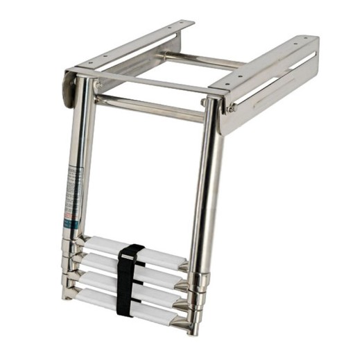 Teleskopowa drabinka jachtowa, chowana w kasecie, wykonana ze stali kwasoodpornej A4 (Odporna na słoną wodę). Cztery antypoślizgowe stopnie.
