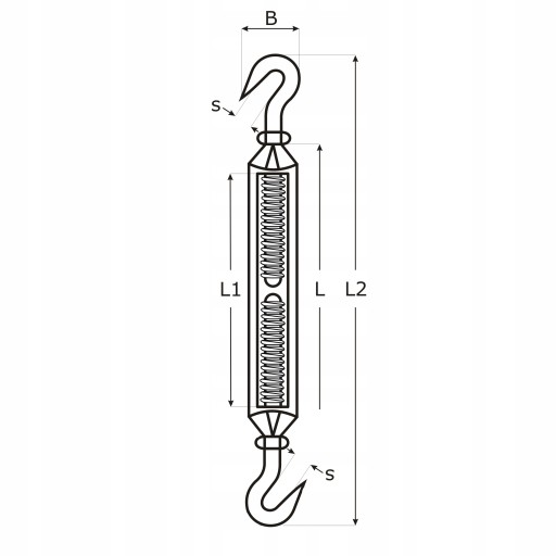 Śruba jest zakończona z obu stron hakami, które można zaczepiać o inny osprzęt np. szekle, karabińczyki, ogniwa czy też w śruby lub nakrętki z uchem.