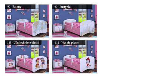 Każdy z mebli może być wykonany z motywami dostępnymi na łóżeczkach.