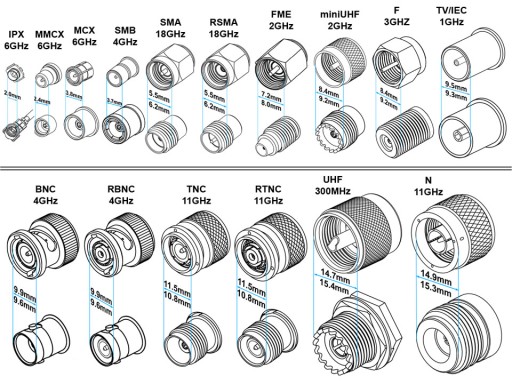 Do przesyłania sygnałów RF (Radio Frequency - wysokie częstotliwości MHz-GHz) stosowanych jest wiele rodzajów złącz koncentrycznych. W urządzeniach i antenach TV, SAT, FM, DAB, DVB, GSM, GPS, WiFi itp. występują złącza przeznaczone do pracy w zakresach częstotliwości od kilkudziesięciu MHz do kilkudziesięciu GHz. Najczęściej stosowane obecnie złącza prezentuje tabela poniżej - prezentujemy w niej wygląd wtyków i gniazd danego typu, maksymalną częstotliwość pracy oraz przybliżone średnice złącz.