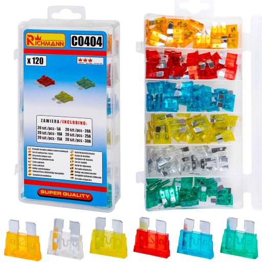 W zestawie znajdują się standardowe bezpieczniki o różnych poziomach amperarzy.