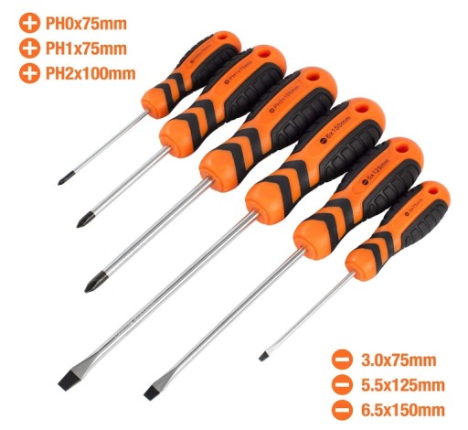 Ten wysokiej jakości zestaw wytrzymałych wkrętaków ze stali chromowo-wanadowej zawiera 3 wkrętaki płaskie i 3 wkrętaki krzyżakowe w różnych rozmiarach i długościach.