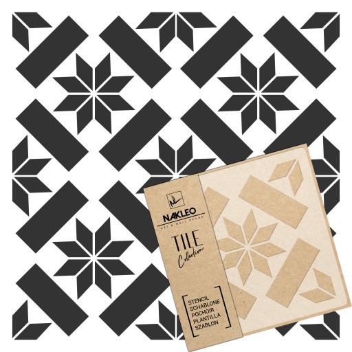 Nakleo Tile Collection to szablony malarskie wielokrotnego użytku wykonane z wytrzymałego tworzywa sztucznego będące imitacją wzorów występujących na płytkach ceramicznych. W kolekcji dostępne są zarówno klasyczne renesansowe wzory, motywy orientalne jak i współczesne kompozycje geometryczne. Prezentowany na tej aukcji wzór ma wymiary 30x30cm. Na innych aukcjach dostępne są również formaty 10x10cm, 15x15cm, 20x20cm, 25x25cm, 33x33cm, 45x45cm oraz 60x60cm. Szablony można używać dowolną ilość razy dzięki czemu z łatwością pokryjesz nawet największe powierzchnie dowolną kompozycją wzorów i kolorów.