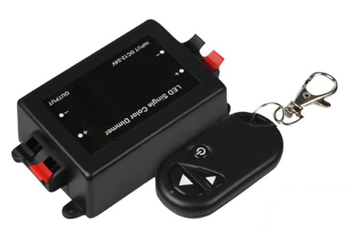 Ściemniacz do taśm i modułów LED sterowany pilotem radiowym. Sterownik pracuje na napięciu 12V i obsługuje urządzenia o zapotrzebowaniu prądowym do 8A na kanał, w sumie 8A / 96W przy 12V