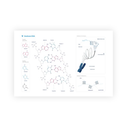 ŚWIETNA POMOC NAUKOWA – Na plakacie znajduje się szczegółowy opis budowy DNA z podziałem na zasady purynowe i pirymidynowe, a także szczegółowy schemat budowy chromatyny oraz nukleosomu.
