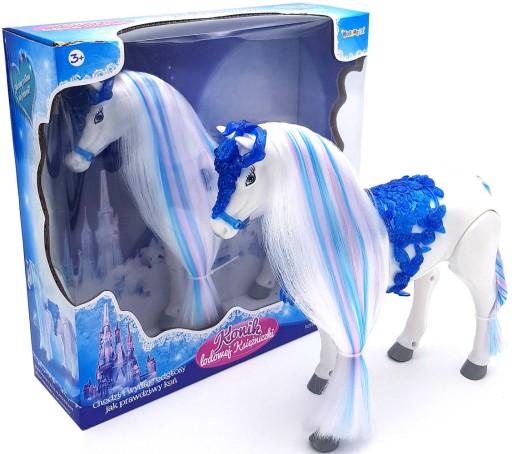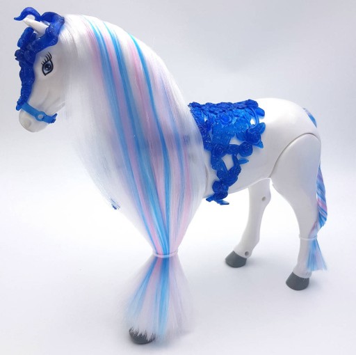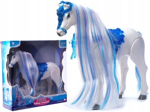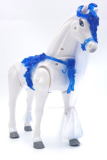Koń ma przepiękną grzywę i ogon, a na grzbiecie ma niebieskie bogato zdobione siodło. Ponadto koń jest interaktywny, a mianowicie sam chodzi wydając przy tym dźwięki.