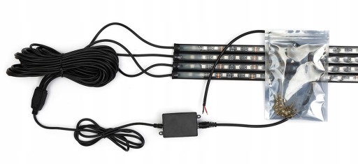 - Zestaw zawiera taśmy LED z samoprzylepnym mocowaniem, kontroler, zasilacz oraz instrukcję obsługi.
