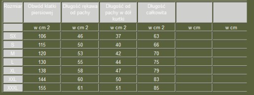 - - wymiary z tabeli odpowiadaja klatce piersiowej i długosci
