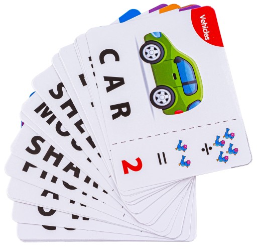Obrazkowe, dwustronne karty mogą posłużyć jako fiszki do nauki języka - ułatwiają zapamiętanie wyrazu.