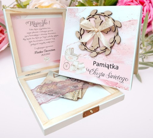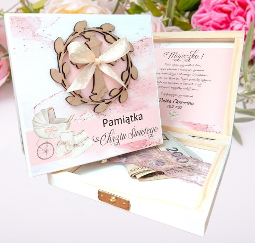 Drewniane pudełeczko z personalizowanymi życzeniami i miejscem na gotówkę lub inny prezent.