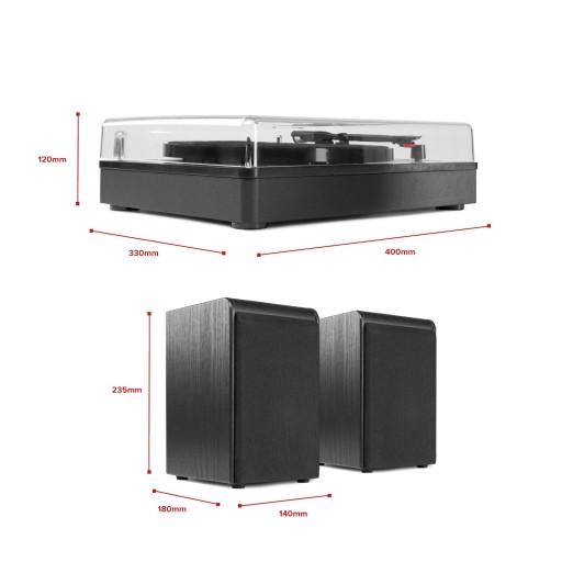 - Wymiary (dł. x szer. x wys.) Gramofon: 330x 407x 120mm Głośnik: 180x 142x 235mm