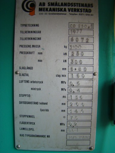 1. SPRZEDAM PRASE MIMOŚRODOWA PRODUKCJI SZWEDZKIEJ SMV CO 250-1 (foto 1-7) O NACISKU MAX 30 TON. PRASA JEST W DOBRYM STANIE TECHNICZNYM. 160 UDERZEŃ NA MIN. , REGULOWANY SKOK 6 DO 80 MM , CENTRALNE SMAROWANIE ,STÓŁ 580* 400 MM,ODLEGŁOŚĆ SUWAKA OD 2-GO STOŁU 300 MM, STEROWANIE RĘCZNE ORAZ NOŻNE, TRYB PRACY MONTAŻOWY, POJEDYNCZY, AUTOMATYCZNY. WAGA 3100 KG