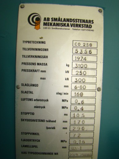 2. SPRZEDAM PRASE MIMOŚRODOWA PRODUKCJI SZWEDZKIEJ SMV CO 250-1 (foto 8-14) O NACISKU MAX 30 TON. PRASA JEST W DOBRYM STANIE TECHNICZNYM. 160 UDERZEŃ NA MIN. , REGULOWANY SKOK 6 DO 80 MM , CENTRALNE SMAROWANIE ,STÓŁ 580* 400 MM,ODLEGŁOŚĆ SUWAKA OD 2-GO STOŁU 300 MM, STEROWANIE RĘCZNE ORAZ NOŻNE, TRYB PRACY MONTAŻOWY, POJEDYNCZY, AUTOMATYCZNY. WAGA 3100 KG