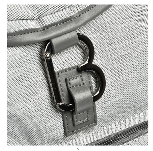 - system uniwersalnych, praktycznych uchwytów: rączka z ekoskóry do przenoszenia w ręku, paski do mocowania plecaka na ramie wózka oraz szeroki pas do mocowania na uchwycie walizki (zintegrowany z plecami);