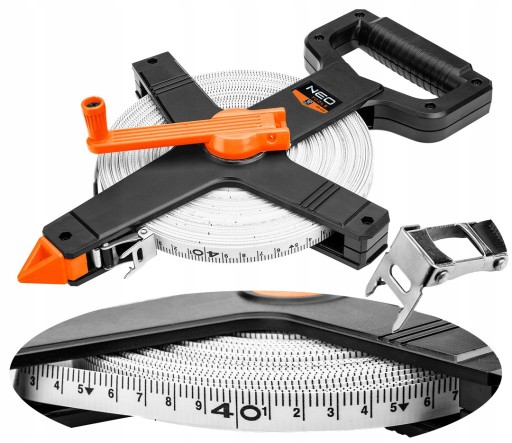 Taśma miernicza włókno szklane 50 m 68-051 marki NEO to narzędzie o długości 50 metrów i szerokości 13 mm. Taśma wykonana z włókna szklanego, znajduje się w trwałej obudowie ze sztucznego tworzywa. Jest łatwa w rozwijaniu i zwijaniu. Dodatkowo korpus posiada zaczep końcowy, umożliwiający zamocowanie taśmy w glebie. Takie rozwiązanie wpływa na komfort przeprowadzania szczególnie dłuższych pomiarów. Ergonomiczny, antypoślizgowy uchwyt ułatwia pracę.
