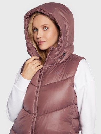 Bezrękawnik 4F puchowy pikowany z kapturem damski. Posiada luźny, przedłużony krój i szerokie pikowanie.