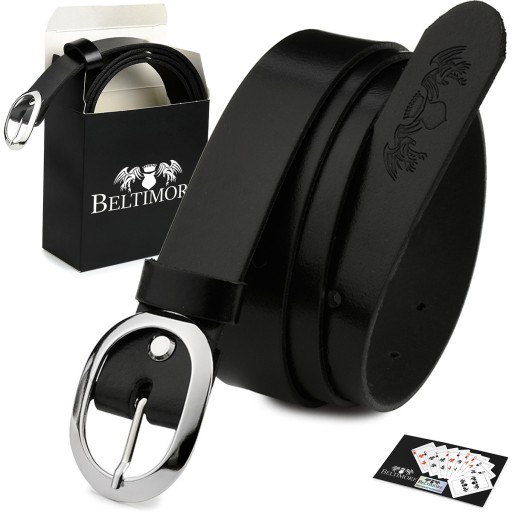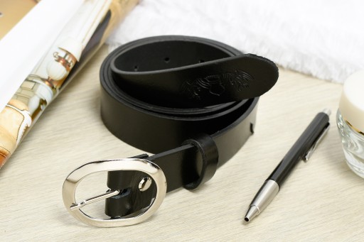 Piękny, skórzany, damski pasek do spodni marki Beltimore. Jest wytrzymały, solidny, w czarnym kolorze z bardzo wygodną i kontrastującą w srebrnym kolorze klamerką. Całość rewelacyjnie współgra ze sobą i wygląda bardzo elegancko.