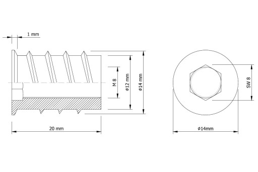 - Mufa do drewna posiada nacięcie na klucz imbusowy SW 8 MM w celu łatwiejszego wkręcenia w wywiercony otwór.