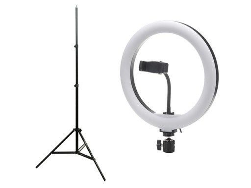 Zestaw składający się z ledowej lampy pierścieniowej światła stałego (ciągłego), statywu oświetleniowego, uchwytu na smartfon oraz głowicy pozwalającej na zamontowanie lampy do statywu.