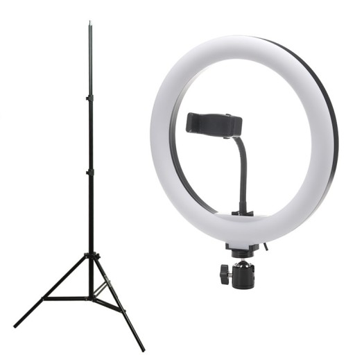 Nowoczesna lampa pierścieniowa ze światłem diodowym o zmiennej temperaturze barwowej, wykorzystywana jest przy nagrywaniu filmów na Youtube, video blogów, fotografii makijażu, fotografii macro, produktowej oraz portretowej.