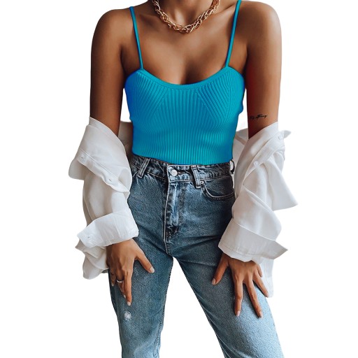 Krótki top na cieniutkich ramiączkach wykonany został z prążkowanego, bardzo rozciągliwego materiału. Bardzo efektownie wyglądający, idealnie dopasowuje się do sylwetki, dzięki czemu pięknie podkreśla kobiece atuty. Dostępny w pięciu kolorach.