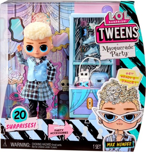 LOL Tweens 584131 - Laleczka Max Wonder z serii Masquerade Party to idealny prezent dla każdej dziewczynki. Laleczka posiada dwa zestawy ubrań, akcesoria do strojów oraz stojak. Pudełko jest jednocześnie pokojem do zabawy! Zestaw posiada 20 niespodzianek.