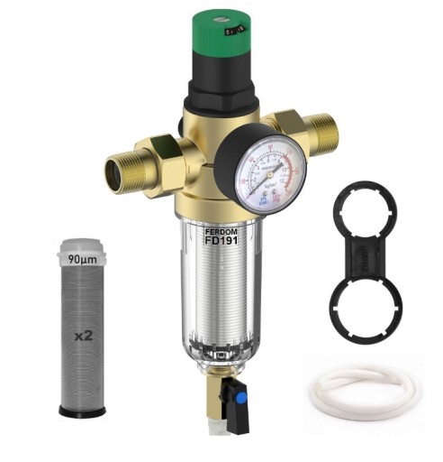 Wbudowany w FD191 reduktor ciśnienia FERDOM zabezpiecza domowe instalacje i urządzenia wodne przed nadmiernym ciśnieniem z sieci zasilającej.