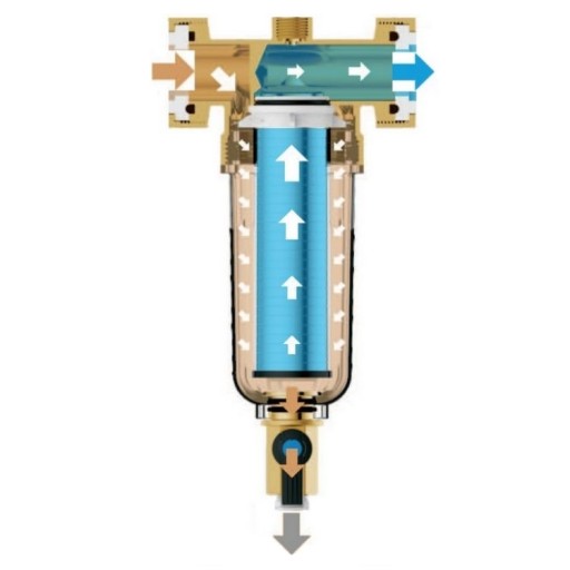 - typ filtra Spin Down - po otworzeniu zaworu spustowego wir wody z sieci przesuwający się do dołu czyści wkład i usuwa zebrane zanieczyszczenia.