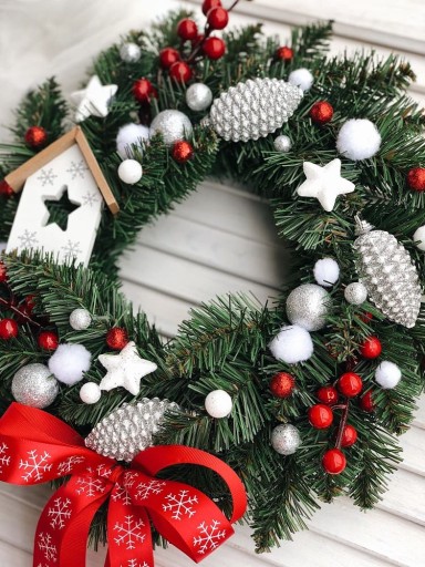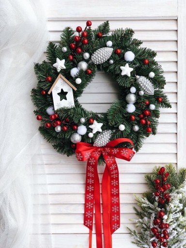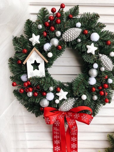 Świąteczny wianek, ozdobiony bombkami, gwiazdkami, sztucznymi gałązkami głogu oraz drewnianym domkiem i kokardką.