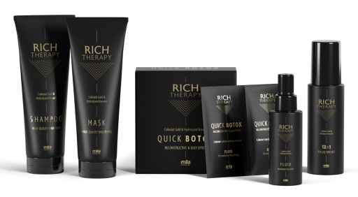 Tajemnica pięknych włosów ukryta jest w ich wnętrzu. Dostarczenie odpowiednich składników odżywczych procentuje zdrowym i pełnym blasku wyglądem. Receptury wszystkich produktów Rich Therapy skrywają w sobie wyszukane połączenie złota koloidalnego i płynnej keratyny. Te dwa główne składniki zapewniają dogłębne odżywienie włosów i poprawę kondycji skóry głowy, a pielęgnacja nabiera luksusowego charakteru. Formuły Rich Therapy wspierają dodatkowo składniki nawilżające takie jak pantenol czy kwas hialuronowy oraz emolienty pochodzenia roślinnego, które wspomagają kompleksową odbudowę strukturę włosa.