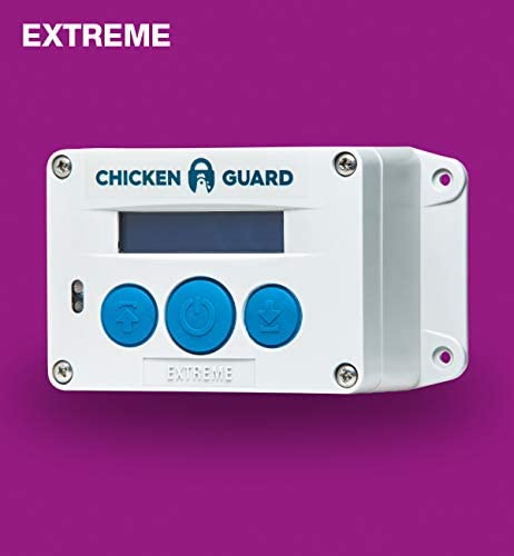 Model ChickenGuard 'Extreme' z programatorem czasowym i czujnikiem światła Lux ma zwiększony udźwig drzwi do 2kg. Nie ma minimalnej ani maksymalnej wysokości drzwi. ChickenGuard dostarcza również bardzo wytrzymałą linkę, której wytrzymałość na zerwanie wynosi 25kg.
