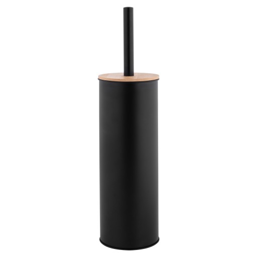 Szczotka WC wykonana z wysokiej jakości stali malowanej na czarno z elementami naturalnego drewna bambusowego.