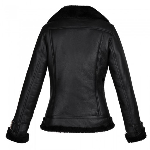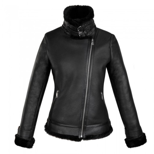 Kożuch w fasonie klasycznej, damskiej ramoneski. Bardzo ciepły, wykonany z wysokiej jakości skóry jagnięcej kożuchowej, w czarnym matowym kolorze. Kołnierz, rękawy oraz dół zakończone bardzo przyjemnym i miękkim włosiem. Kurtka zapinana na asymetryczny zamek. Wysoki, wykładany kołnierz w formie stójki ze skóry kożuchowej stanowi doskonałą ochronę przed mrozem i jest jednocześnie ozdobą kożucha.