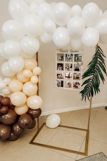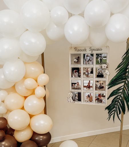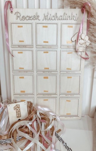 Personalizowana drewniana tablica na zdjęcia z pierwszego roku dziecka. Tablica idealnie spisze się jako dekoracja podczas urodzinowej uroczystości, a także ciekawie przystroi pokoik dziecka.
