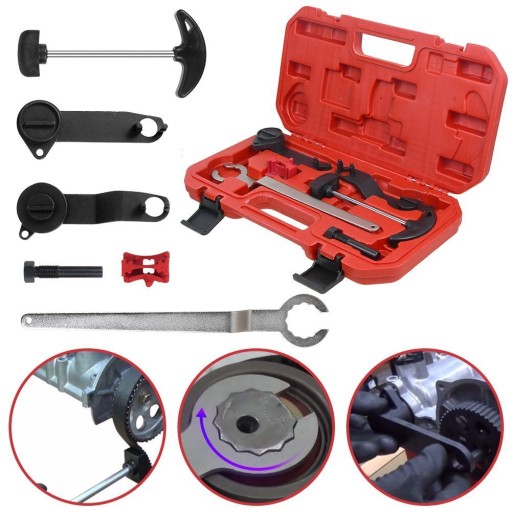 Zestaw zawiera m.in. blokadę wału korbowego, koła zębatego rozrządu, napinacz koła pasowego oraz trzpień do wału.