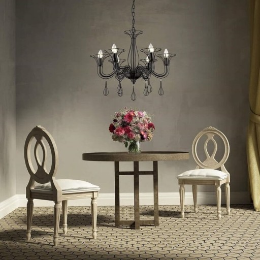 Tarragona 6 wisząca - trzeba naprawdę wielu słów, by dokładnie opisać ten produkt oświetleniowy. Chciałoby się rzec, że w jednym zdaniu jest to oświetlenie zwracające na siebie dużą uwagę! Mianowicie, konstrukcja lampy składa się z pięciu metalowych odnóg, w kształcie litery "U", zakończone wejściem na źródło światła, których jest sześć.Pasujące żarówki to model - E14. Całość wisi na pięknym łańcuchu. Stelaż nie jest jednolity w budowie, bowiem posiada kilka cieńszych prętów łączących się ze sobą na górze ramienia. Całość utrzymana w barwach czerni. Na dole każdego z ramion lampy wiszące Tarragona, wiszą elementy dekoracyjne, również z metalu w kształcie łezki. Z całą pewnością, oświetlenie to jest, utrzymane w stylu hiszpańskim, zatem pięknie będzie się prezentować w czerwonych, pomieszczeniach urządzonych z charakterem. Serdecznie polecamy i zapraszamy do zakupu!