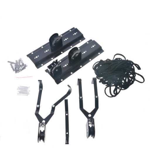 Haczyki mocowane do roweru zapobiegną jego porysowaniu. Prowadnice umożliwią łatwe podnoszenie i opuszczanie roweru. Uchwyt mocowany do ściany pozwoli nam na owinięcie pozostałości linki wokół niego.