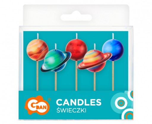 Kolor: Różnokolorowy Wzór: Planety Wysokość świeczek: 3 cm Wysokość całkowita (z patyczkiem): 7 cm Ilość sztuk w opakowaniu: 5