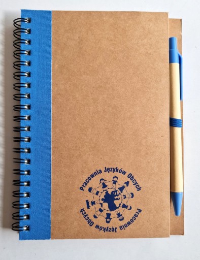 Notes z 70 czystymi kartkami z recyklingu i długopisem z niebieskim wkładem.