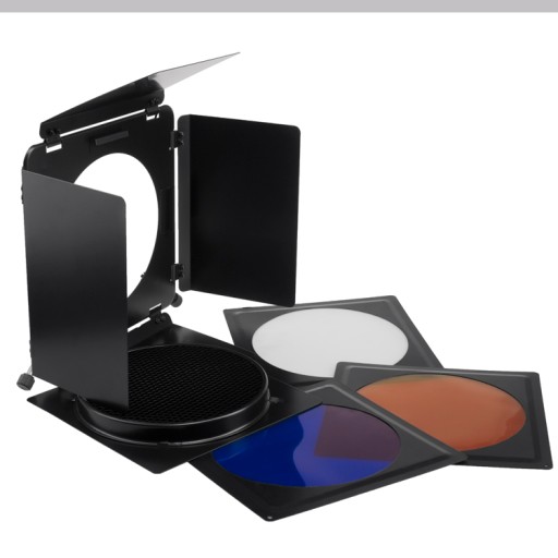Wysokiej jakości, wykonane z metalu wrota do studyjnych lamp błyskowych. Poprzez regulację ustawienia skrzydeł, wrota w kontrolowany sposób ograniczają rozproszenie światła.