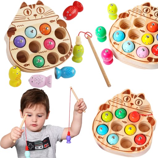 Każdy rodzic z pewnością pamięta "grę łowienie rybek". Teraz Twoje dziecko może pobawić się "twoimi zabawkami" w nowej odsłonie. Piękna drewniana gra w kształcie kota z kolorowymi rybkami jest świetnym odświeżeniem "starej gry".